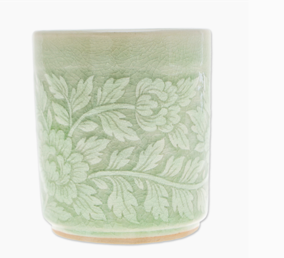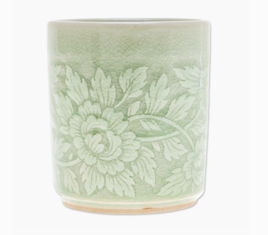 The glorious technique of celadon pottery adorns this classic teacup. Inspired by baroque trends and the beauty of peony blooms. Crackled finish enriches the floral details. Set of 2 cups.