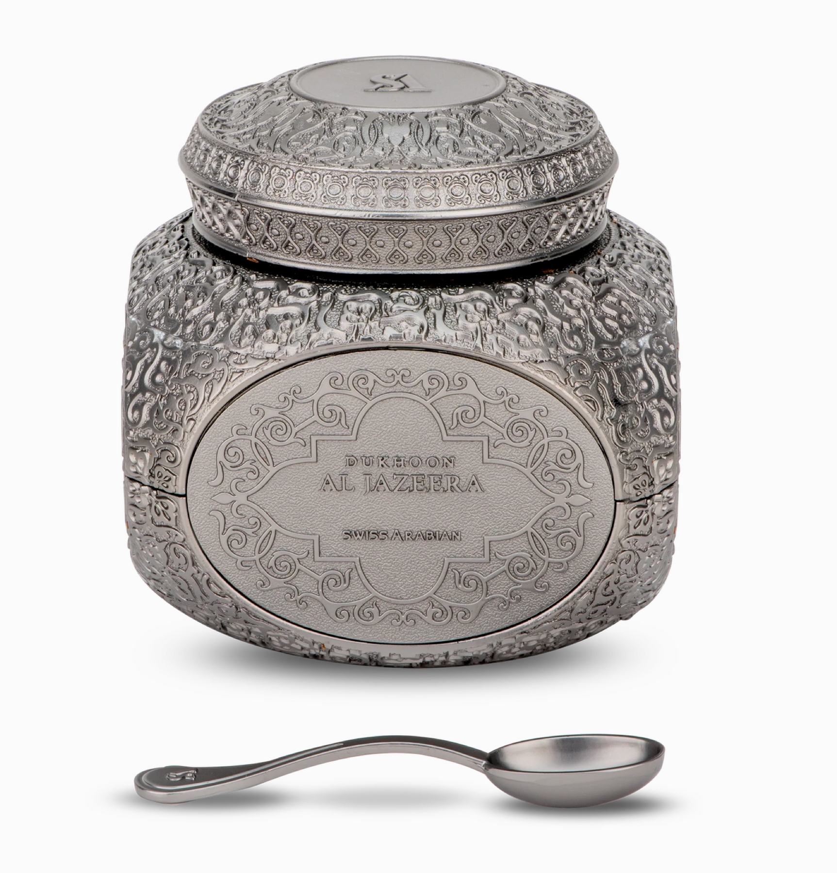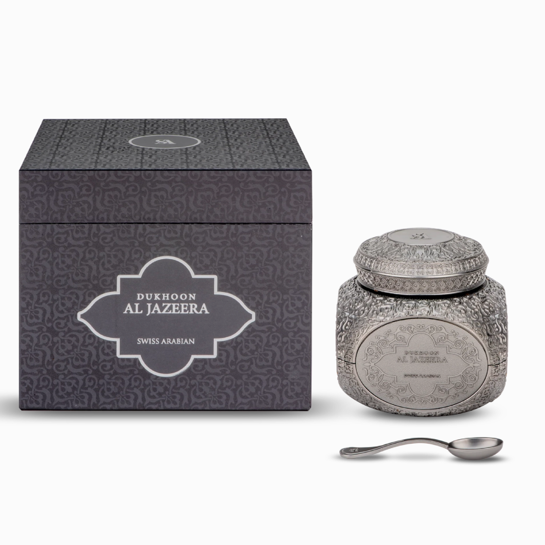 Dukhoon Al Jazeera by Swiss Arabian is a luxurious home fragrance powder incense that fills your space with the warmth of rose petals infused with precious oud. A dreamy blend of floral elegance and rich woods, it opens with radiant rose and golden oud. Spicy saffron and cardamom lead into a heart of amber and green notes, while the base settles into a lasting veil of patchouli, sandalwood, and musk. A signature Arabian scent that brings depth, harmony, and allure to your home.