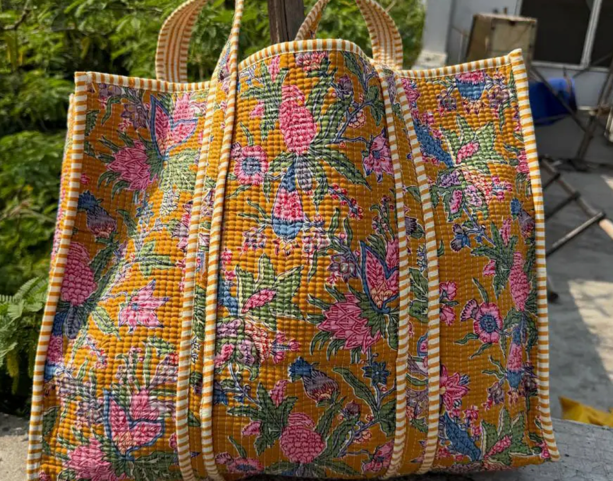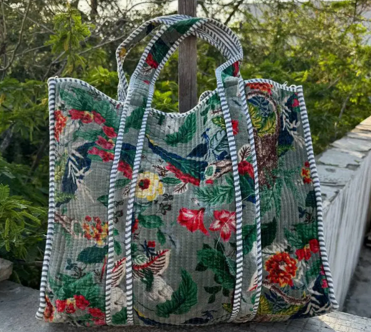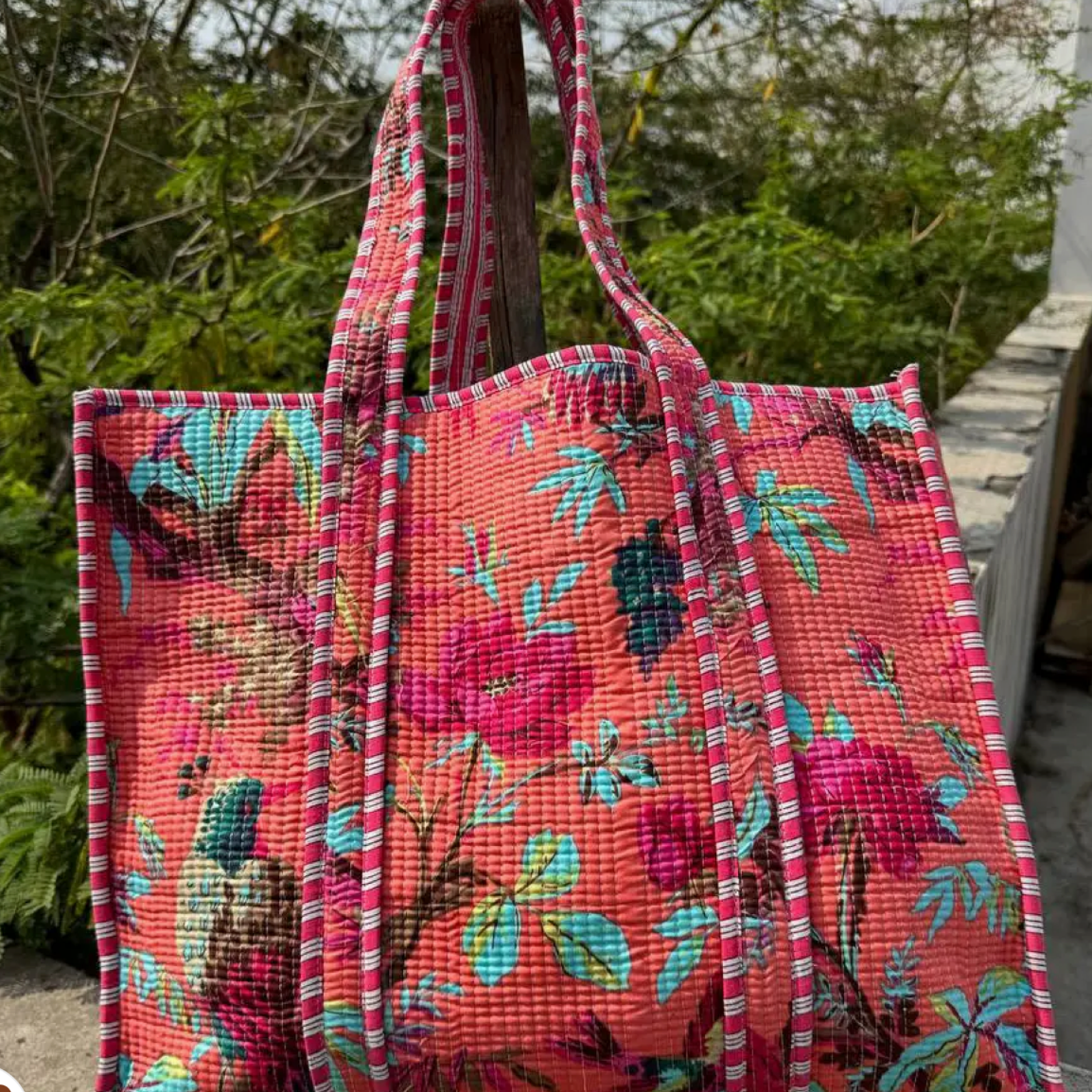 This cotton quilted shopping bag is prefect for groceries or as a travel bag.