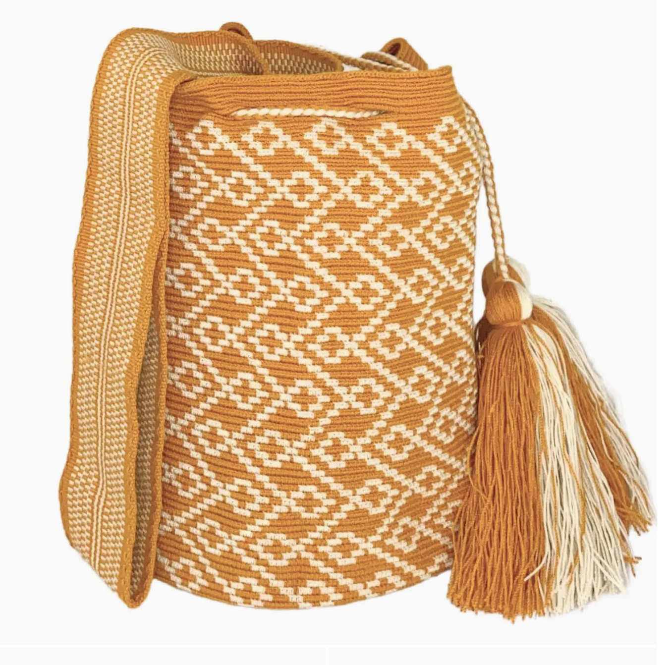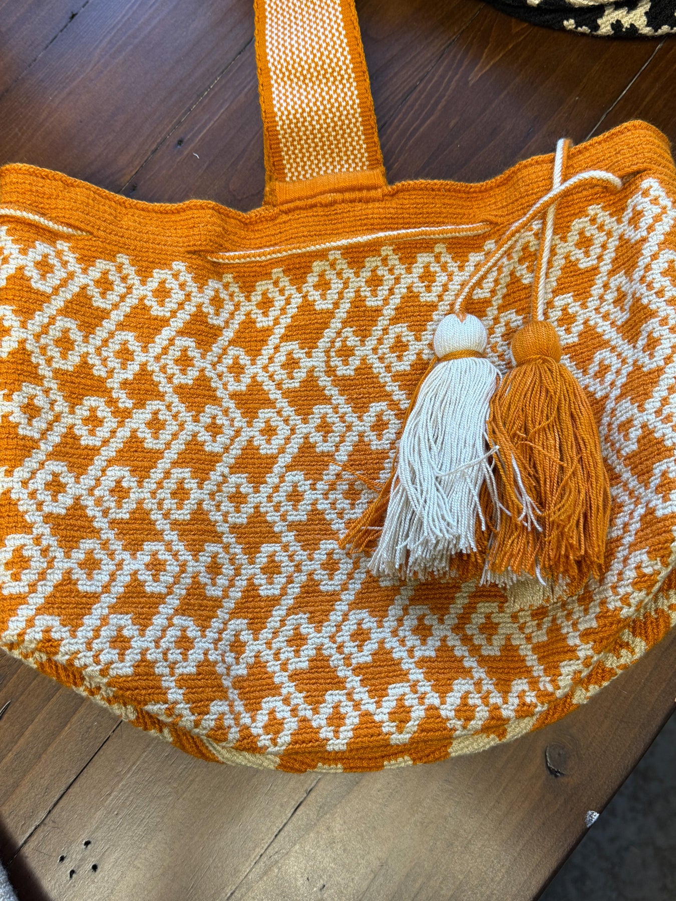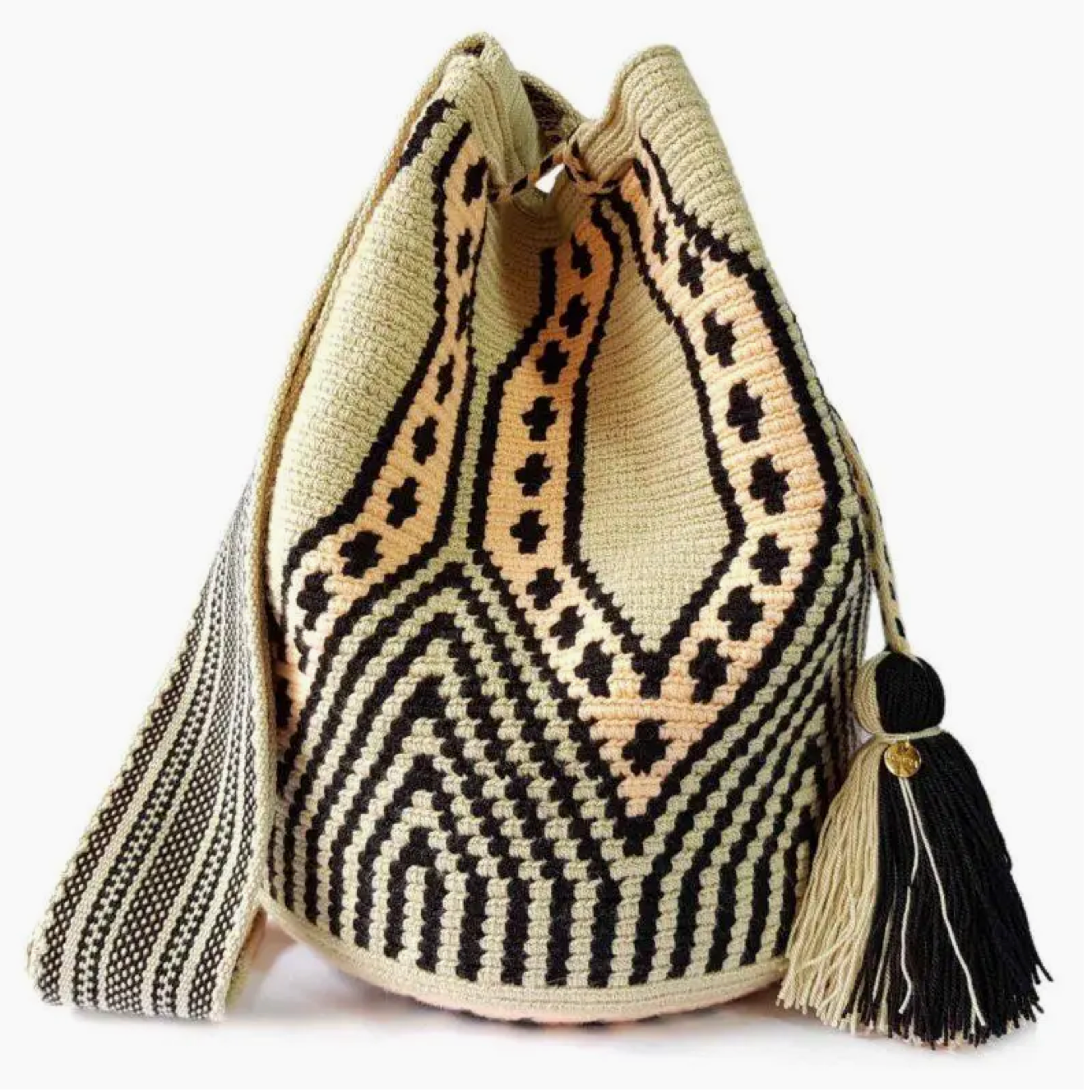 These bold geometric patterned bags are handmade by artisans from Colombia. Bucket bag style with a drawstring closure.