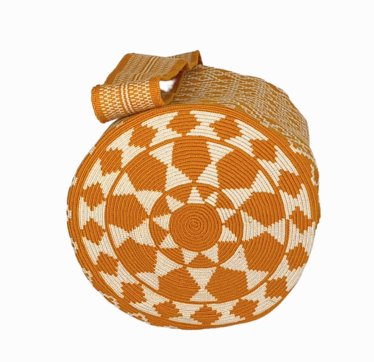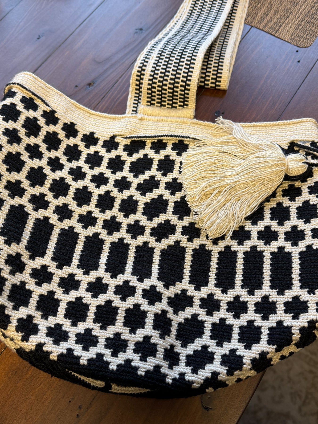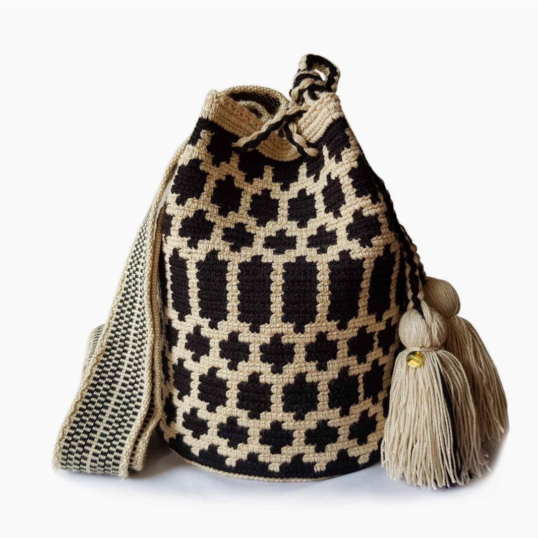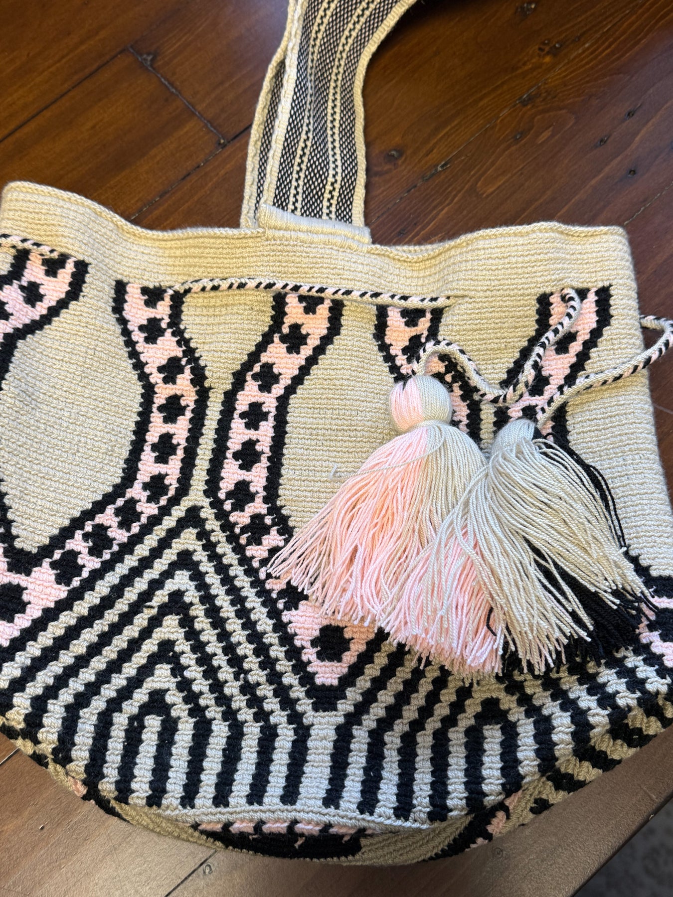 These bold geometric patterned bags are handmade by artisans from Colombia. Bucket bag style with a drawstring closure.