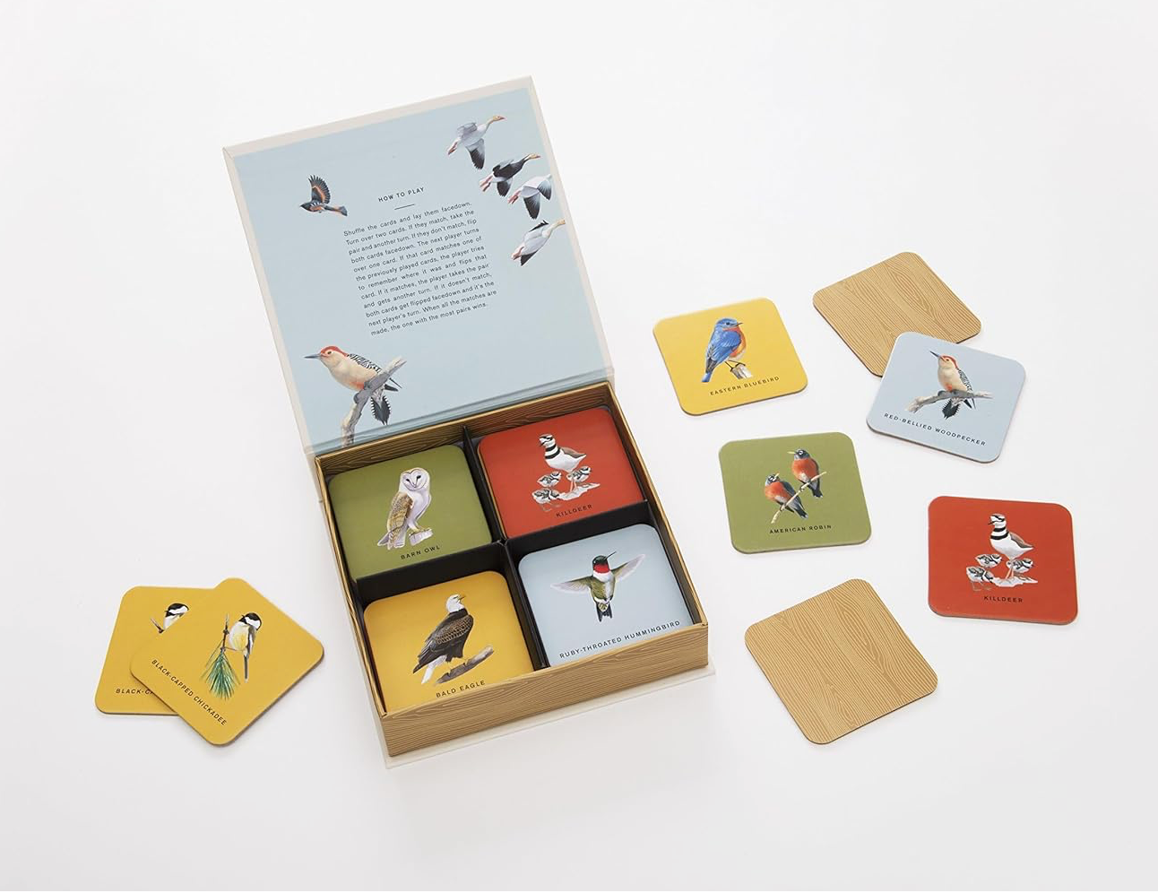 The Sibley Backyard Birds Matching Game works your memory with 40 pieces, featuring 20 backyard birds, including blue jays, sparrows, and hummingbirds. The beautiful hand-painted illustrations are designed to grab the attention of kids and parents alike. Age group: fun for players of all ages, suitable for families.